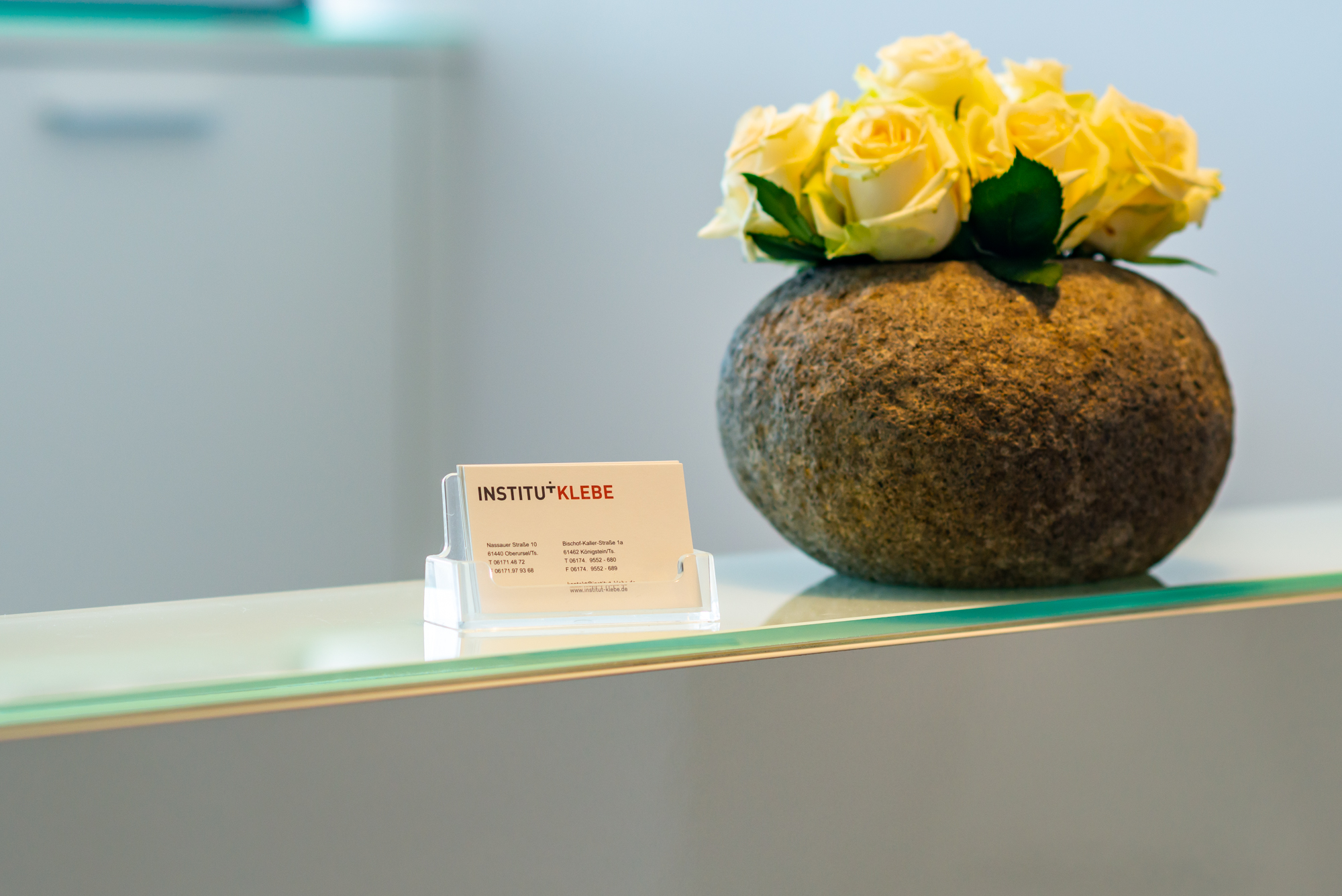 Am Empfang liegen Filzpuschen und personalisierte, praxiseigene Handtücher bereit.